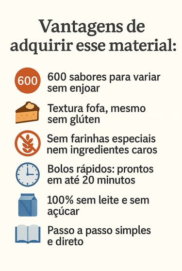 É um material exclusivo que te guia pelas melhores receitas de bolos fit com imagens irresistíveis, passos simples e combinações equilibradas. Criado para que você mantenha o sabor e o prazer de comer bem, cuidando do corpo ao mesmo tempo